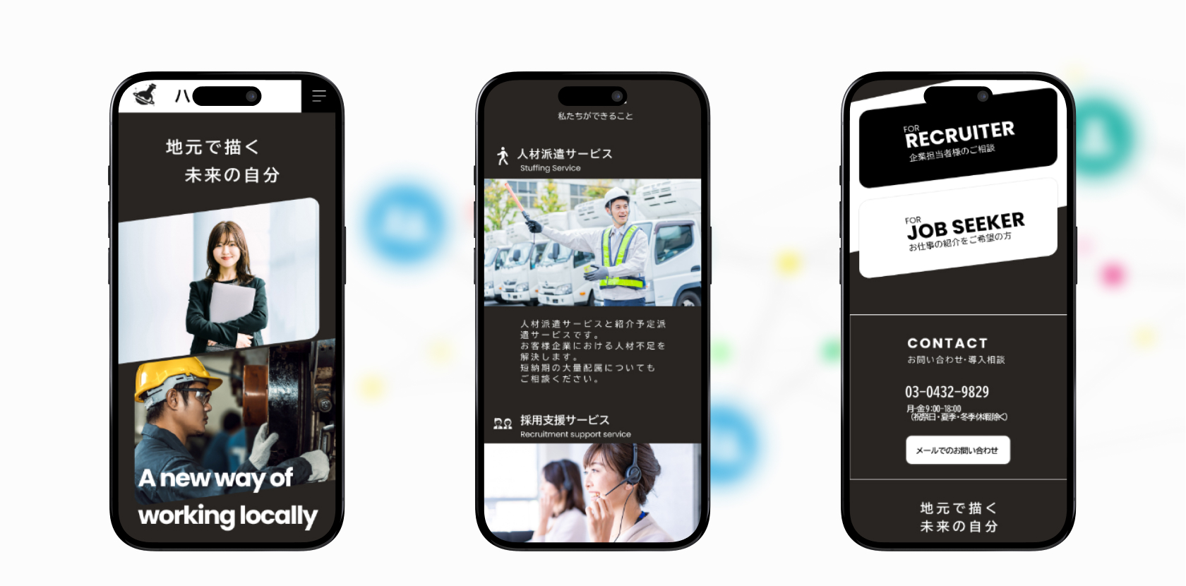 | CONCEPT | 「新しい環境・新しい挑戦・新しい自分」というコンセプトのもと、総合人材サイトを制作しました。 スタイリッシュなデザインを意識し、メインカラーにはダークブラウンを採用しました。またユーザーの離脱を防ぐため、求人情報はページ上部に配置し、必要な情報にすぐアクセスできるよう設計しました。実際の利用者の声(口コミ)を掲載することで、初めて訪れる方にも安心感を持っていただける構成にしています。 |