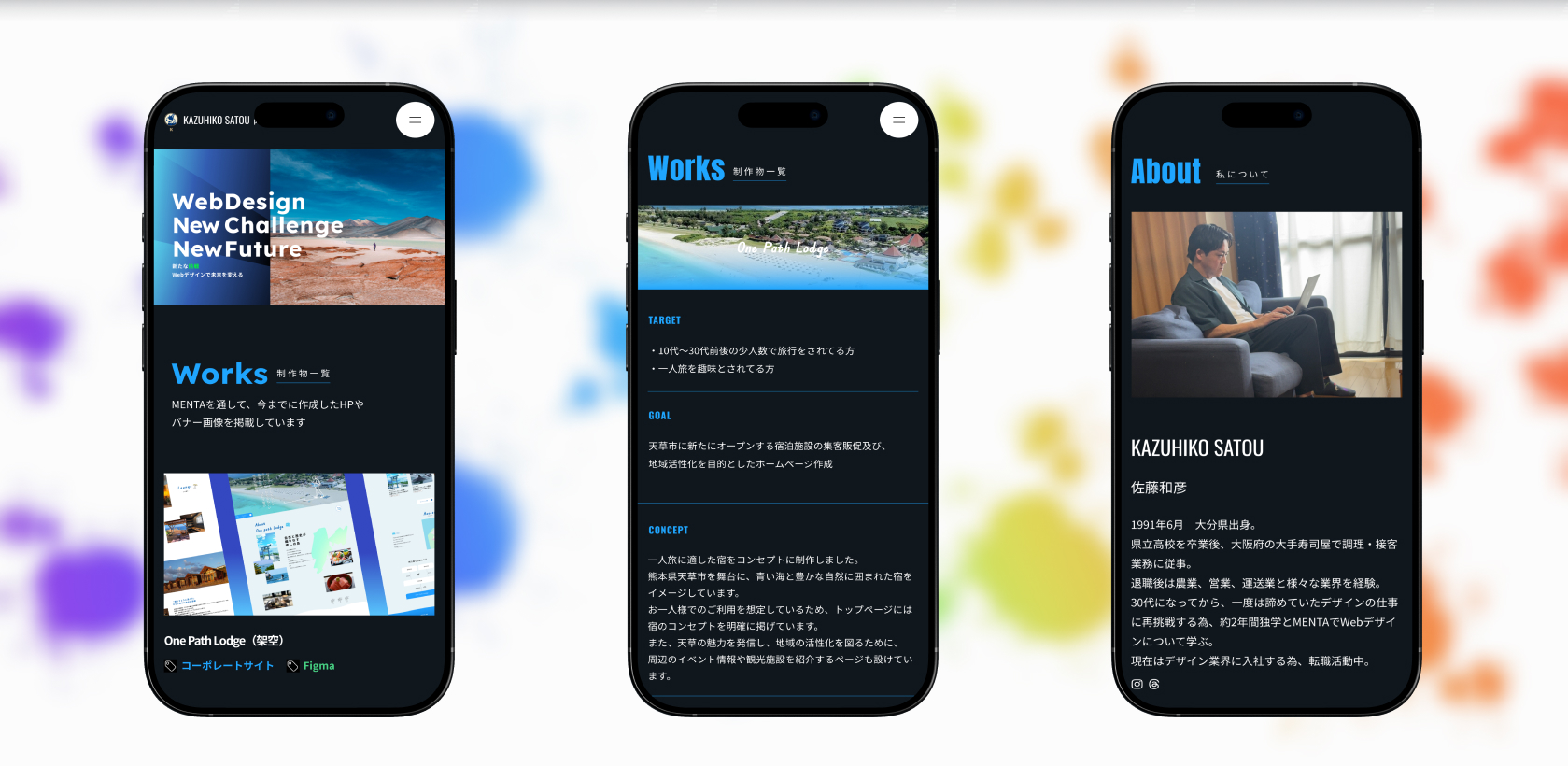 | CONCEPT | デザイン会社への就職を目指し、自身の実績やスキルを視覚的に分かりやすく伝える手段として、ポートフォリオを作成しました。採用担当者の方に、自分がどのような価値を提供できるかを明確にお伝えするため、最初に制作実績を配置しています。 また、自身の強みや人柄、学習の過程についても紹介し、より多面的に自分を理解していただくことで、採用へとつなげたいと考えています。 |